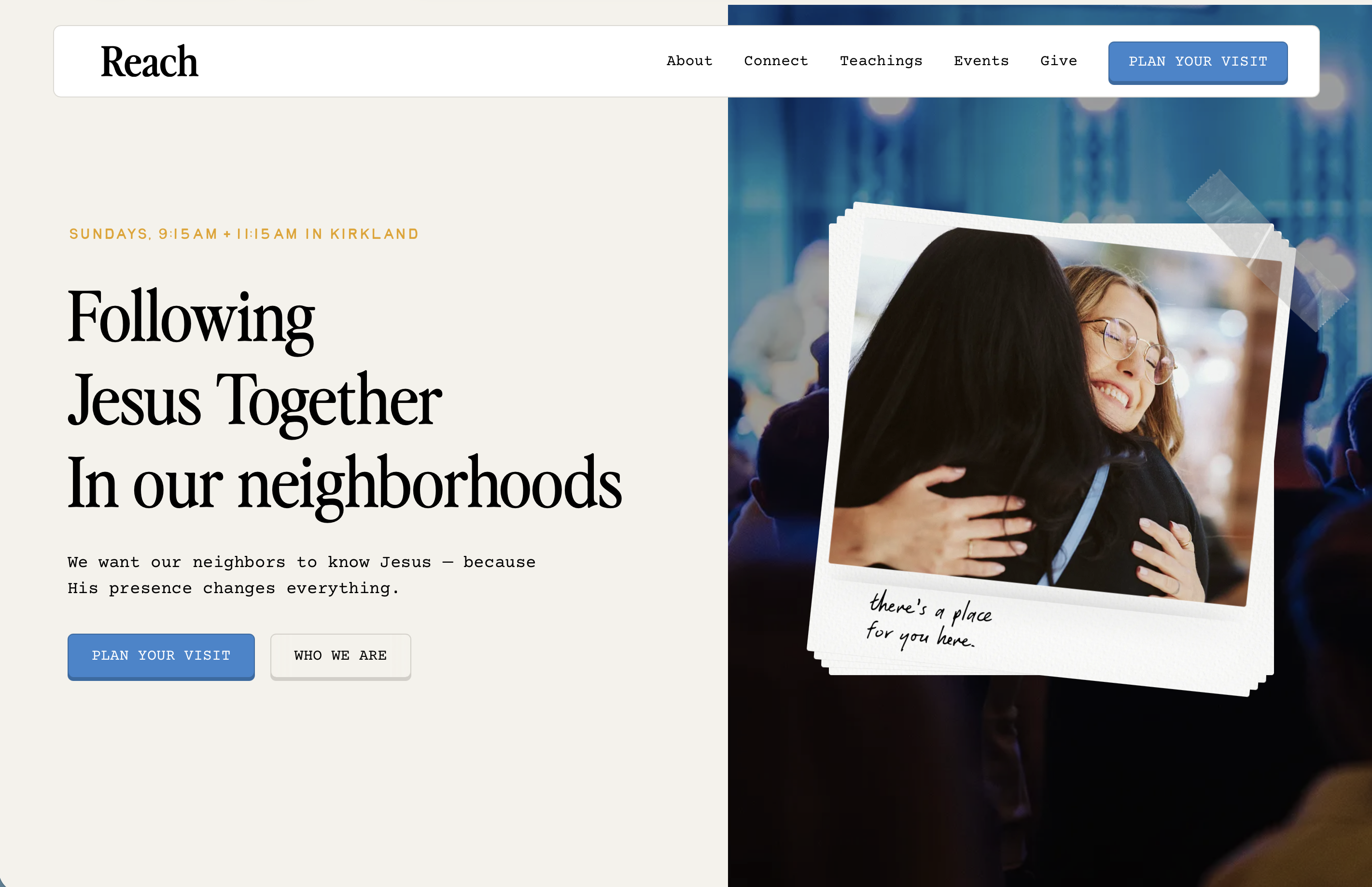 Every Sunday Best project includes a custom design tailored to your church’s unique vision, full development on Webflow, a focused strategy to help visitors take next steps, dynamic animations, mobile-responsive design, CMS setup for sermons and events, standard SEO implementation, and accessibility features. Learn more about what’s included.